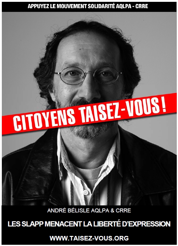 L’AQLPA est fière de rappeler que c’est grâce à la lutte qu’elle a initiée, menée et gagnée qu’aujourd’hui le Québec est la seule législature au Canada qui protège la liberté d’expression et la participation citoyenne aux débats publics contre l’intimidation et les poursuites abusives. Nous avons travaillé d’arrache-pied jusqu’à l’obtention de la Loi 9 ou Loi modifiant le Code de procédure civile pour prévenir l'utilisation abusive des tribunaux et favoriser le respect de la liberté d'expression et la participation des citoyens aux débats publics qui a permis à cinq occasions depuis 2009 de rejeter de telles tentatives de musellement.