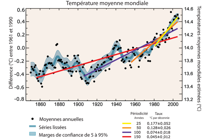 Depuis le début de l’ère industrielle, la pente du réchauffement est de plus en plus abrupte à mesure que se raccourcit l’horizon de mesure, laissant entrevoir une tendance exponentielle inquiétante.