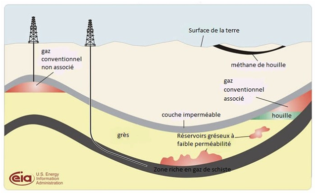 On observe que le gaz de schiste est beaucoup plus profond dans les roches de très faible perméabilité et se disperse sur de grandes zones souterraines.